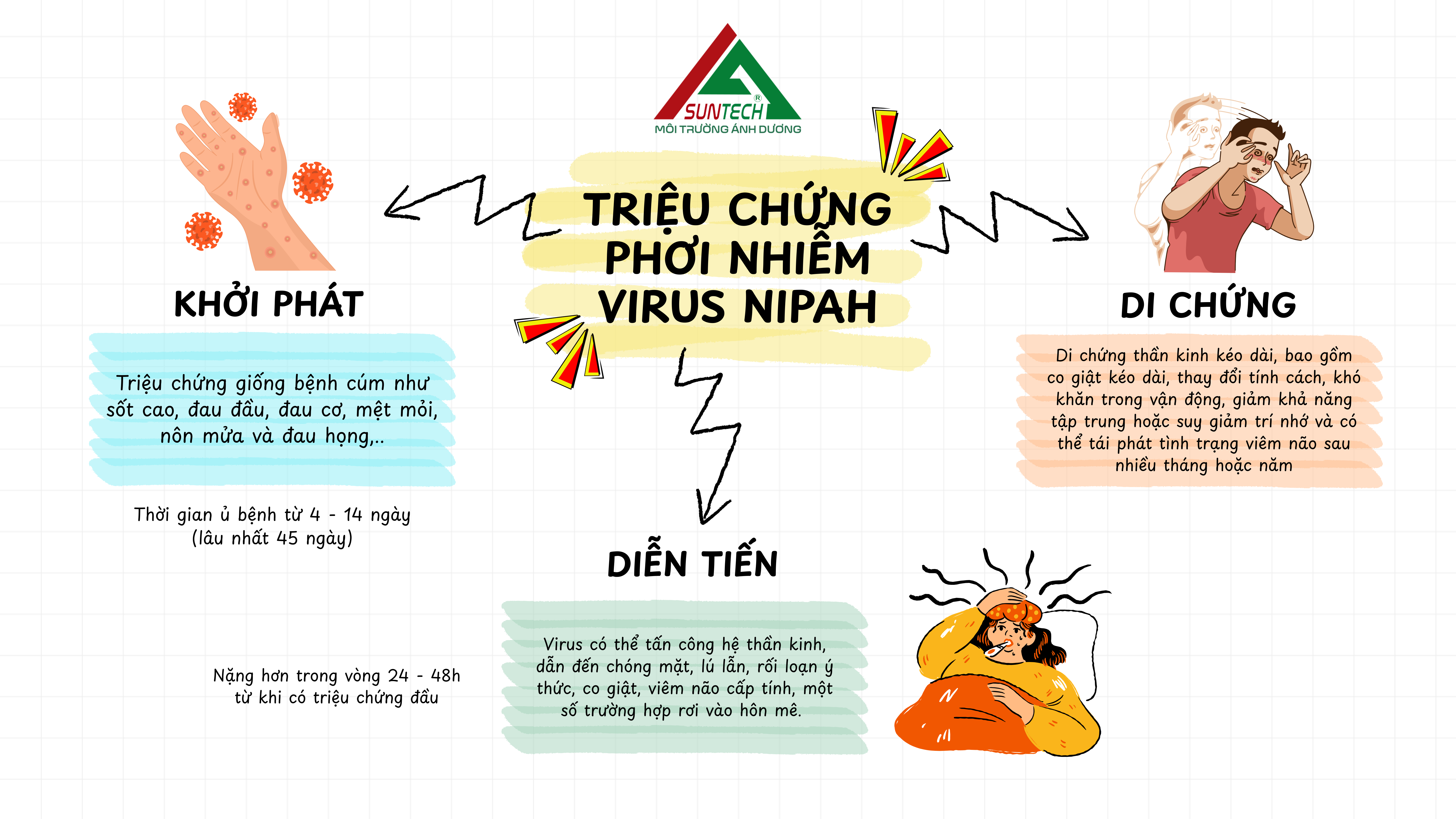Sau khi phơi nhiễm, virus Nipah có thời gian ủ bệnh trung bình từ 4–14 ngày, trong một số trường hợp có thể kéo dài hơn lên đến 45 ngày.