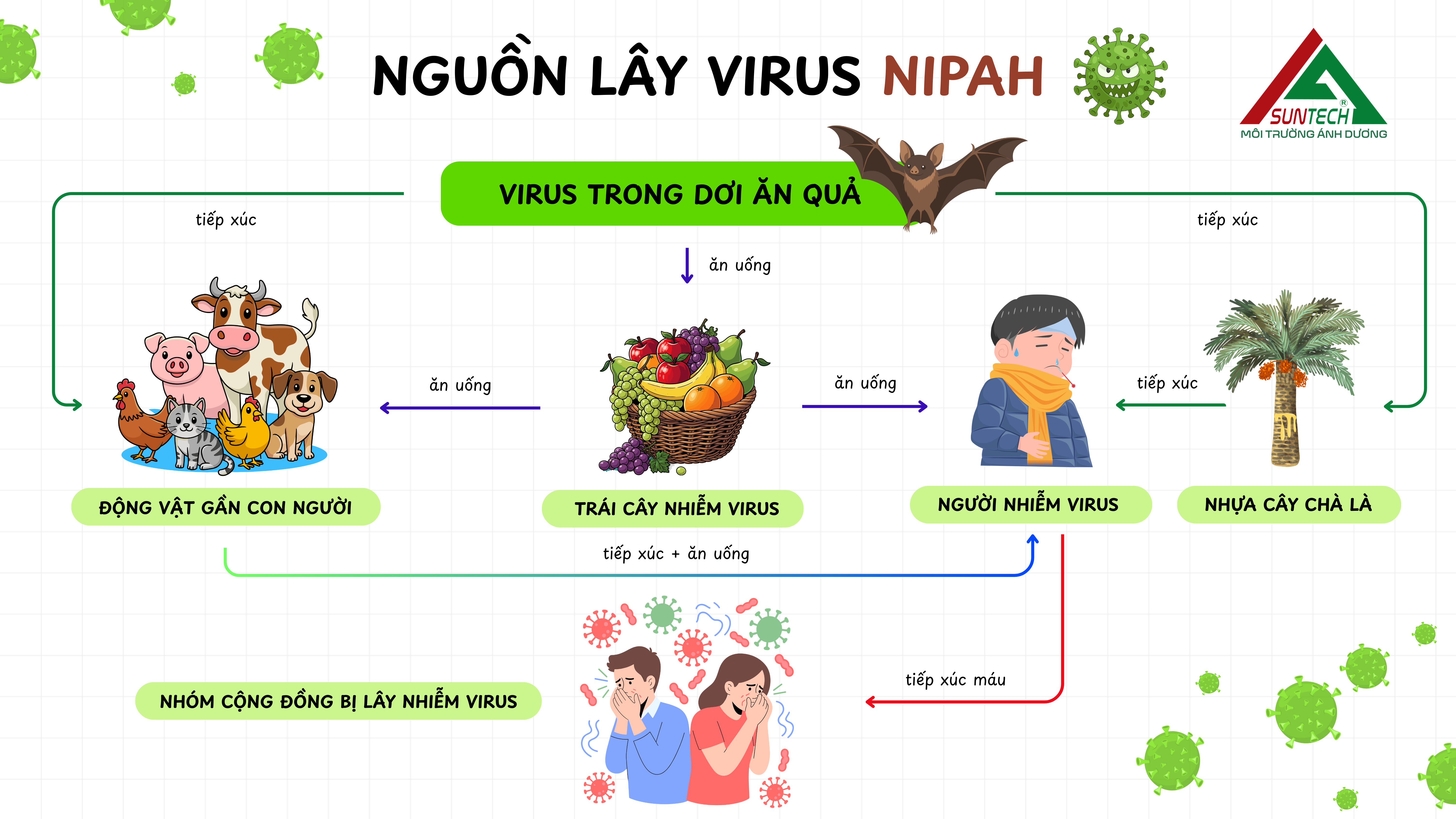 - Từ động vật trung gian (gia súc, vật nuôi gần con người) sang người thông qua tiếp xúc trực tiếp do động vật ăn phải thực phẩm chứa virus Nipah và do người ăn thịt động vật có chứa virus Nipah.